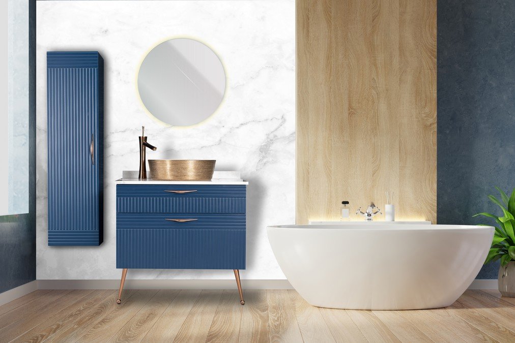 Modern Bathroom interior design on dark blue wall.